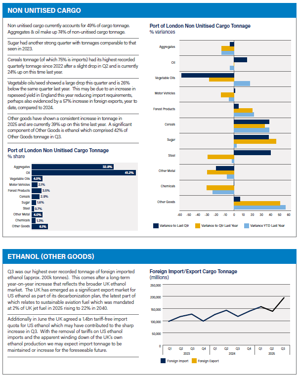 Vegetable oils and seed dropped sharply in Q3 after steady growth since Q2 of 2024. Other Goods which comprise 3% of all tonnage and 6% of non-unitised tonnage have increase steadily since Q3 of 2024 and are currently 39% up on this time last year.