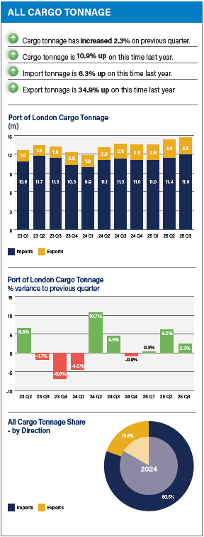 Following a strong Q2, cargo tonnage has increased again this quarter by 2.3% to a total of 14.7m tonnes. This was attributable to a 4% increase in imports while export tonnage actually fell by a similar proportion. Imports currently account for 80.5% of tonnage (compared to 83.4% in 2024).